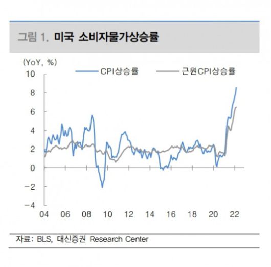 이 연구원은 "물가상승률이 고점을 통과하더라도 3분기까지는 여전히 6~7%를 상회하는 높은 수준의 물가상승률이 지속할 것으로 예상된다"며 "최근 중국 코로나19 확산세와 에너지 가격에 대한 불확실성이 존재하고 있기 때문에 연준은 3분기까지는 긴축 기조를 유지할 전망"이라고 밝혔다.
