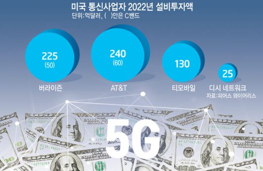 5G 커버리지면에서 상대적으로 앞선 티모바일은 130억달러를 투자한다. 연말까지 미국 전역에서 2억600만명에게 5G 서비스를 제공한다는 목표다. 후발주자인 디시 네트웍스도 6월까지 5G 커버리지 확보 의무(인구의 20%)를 준수하기 위해 설비투자에 25억달러를 투입한다.