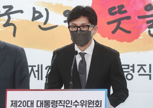 13일 법무부 장관 후보자로 지명된 한동훈 사법연수원 부원장(검사장)이 13일 서울 종로구 통의동 대통령직인수위원회 브리핑룸에서 기자들 질문에 답하고 있다. 공동취재사진 |