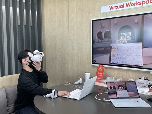 또 하나 눈길을 끈 것은 SK텔레콤의 메타버스 플랫폼 '이프랜드(ifland)' HMD 버전을 활용한 가상 업무공간이다. 한 직원은 실제 HMD를 착용하고 이프랜드 가상공간에서 동료들과 아바타로 회의하는 모습을 시연했다. SK텔레콤은 올 하반기 중으로 이프랜드 HMD 버전을 활용해 가상공간에서의 미팅을 진행할 예정이다.