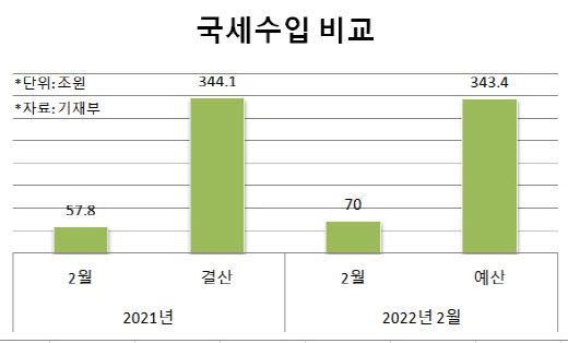 기획재정부가 14일 발표한 월간 재정동향에 따르면 올해 2월까지 국세는 70조원으로 전년동기대비 12조2000억원 늘었다. 세입예산대비 진도율은 20.4%로 같은 기간 3.6%포인트 개선됐다. 그만큼 세수를 걷는 속도가 빠르다는 의미다. 지난해 세정 지원 후 올해 들어온 이연세수분은 8조2000억원으로, 이를 제외해도 진도율은 18.0%다.