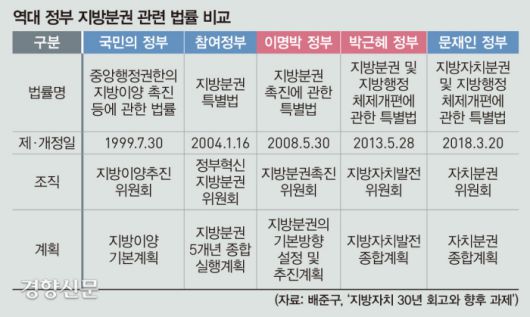 실제로 1948년 정부 수립과 함께 시작된 한국의 지방자치는 1961년 5·16 군사쿠데타와 함께 중단돼 약 30년의 암흑기를 보냈다. 지방자치는 1991년 민주주의의 진전과 함께 부활했고, 1995년 자치단체장을 주민직선으로 뽑으며 비로소 완전한 모습을 갖췄다. 지방자치가 곧 ‘분권의 역사’인 상황에서 자치단체장 후보의 주요 공약이 ‘대통령과의 친밀함’인 것은 분명 모순이다.