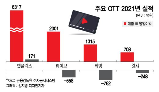 반면 토종 OTT 3사는 울상이다. 웨이브·티빙·왓챠의 통합 매출은 4325억원으로 넷플릭스의 68% 수준에 그쳤다. 반면 3사의 영업손실은 1568억원을 넘었다. 웨이브(-558억원)와 왓챠(-248억원)의 영업손실은 전년 대비 각각 229%, 60% 급증했고 티빙(-762억원)은 1년 만에 12배 이상이 됐다. 가입자를 유치하기 위한 콘텐츠 투자금액이 기하급수적으로 늘어났기 때문이다.