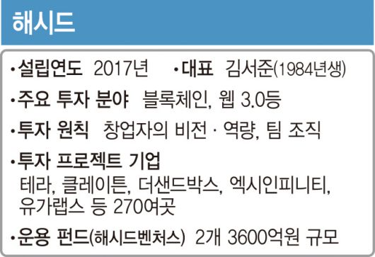 2017년 설립된 해시드는 270여 곳에 투자하고 총 2개의 3600억원 규모의 펀드를 운용하고 있는 국내 대표 블록체인 전문 벤처캐피털(VC)이다. 포항공대를 나온 김서준 대표가 김균태, 김성호 파트너와 공동 창업했다. 일찌감치 ‘테라’ 블록체인에 투자해 대박을 터트린 것으로 유명하다. 티몬 창업자인 신현성 의장과 개발자 권도형 대표가 만든 테라의 암호화폐(루나)는 시가총액 순위 10위권 내에 올라 있다.