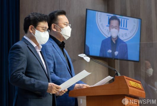[서울=뉴스핌] 황준선 기자 = 유상범 국민의힘 법제사법위원회 간사(오른쪽)와 박형수 의원이 17일 오후 서울 여의도 국회 소통관에서 김오수 검찰총장 사퇴 관련 성명서를 발표하고 있다. 2022.04.17 hwang@newspim.com