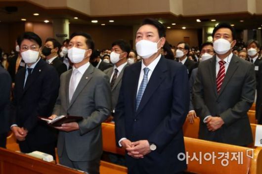 윤석열 대통령 당선인이 17일 서울 여의도 순복음교회에서 열린 '2022 한국교회 부활절 연합예배'에 참석해 예배를 드리고 있다. 왼쪽부터 장제원 비서실장, 김기현 국민의힘 전 원내대표, 윤 당선인, 오세훈 서울시장. /인수위사진기자단 <ⓒ경제를 보는 눈, 세계를 보는 창 아시아경제(www.asiae.co.kr) 무단전재 배포금지>