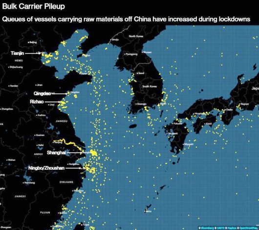 미국 블룸버그통신의 보도에 따르면, 상하이가 봉쇄된 이후 상하이 항구에서 병목현상이 시작됐다. 전 세계에서 몰린 컨테이너선들이 병목현상을 피하기 위해 인근 항구로 우회하면서, 닝보-저우산항까지 혼잡해졌다.