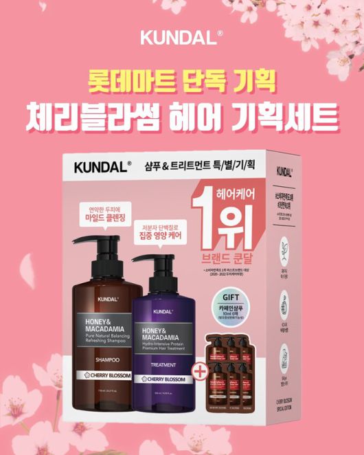 브랜드 측에 따르면 쿤달 ‘체리블라썸 헤어 기획세트’는 ▲쿤달 네이처 샴푸 718ml 체리블라썸향 ▲쿤달 단백질 트리트먼트 500ml 체리블라썸향 ▲쿤달 카페인 탈모샴푸 10ml 6개입으로 구성됐으며 롯데마트 전국 매장에서 만나볼 수 있다.