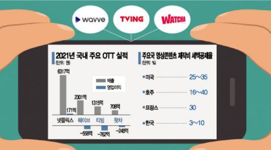 같은 기간 국내 OTT 업체들의 적자폭은 더 커졌다. 웨이브, 티빙, 왓챠 3개사의 총 매출은 4324억원으로 넷플릭스에 크게 못미친다. 영업적자 폭은 1568억원에 달한다. 상황이 어렵지만 3개사 모두 대규모 투자를 단행할 계획이다. OTT 업계 관계자는 "정부에서 OTT 통합 얘기가 거론되고 있는데 업계가 요원한 것은 세액공제액을 경쟁국 수준으로 높이고 OTT 사업자들에게 법적 지위를 부여해 달라는 것"이라며 "K콘텐츠 본거지인 한국에서 자체 플랫폼을 뺏겨서는 안된다"고 말했다.