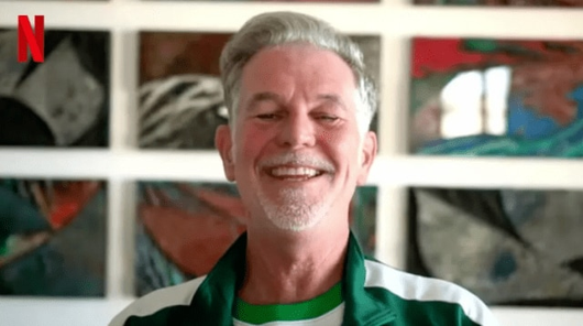 리드 헤이스팅스 넷플릭스 최고경영자(CEO)가 지난 2021년 10월 19일 3분기 실적 발표에 한국 오리지널 드라마 '오징어 게임' 속 초록색 체육복을 입고 나타난 모습. /넷플릭스 유튜브 캡처 |