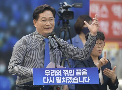 송 전 대표는 17일 서울 홍대 상상마당 앞에서 기자회견을 통해 “이번 지방선거는 윤석열 정부의 일방독주를 견제하는 선거이자 브레이크 없이 질주하는 열차에 안전장치를 다는 선거”라며 “정부·여당 일색의 국무회의에 야당인 민주당 출신 서울시장이 있어야 정부와 다른 입장의 민심도 가감 없이 전달할 수 있다”고 강조했다.