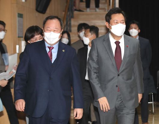 김인호 서울시의회 의장(사진 왼쪽)과 오세훈 서울시장 ⓒ뉴시스 |