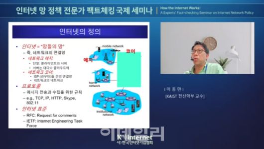 이동만 KAIST 교수가 19일 한국인터넷기업협회가 주최한 ‘인터넷 망 정책 전문가 팩트체킹 세미나’에 온라인으로 참석해 주제 발표를 하고 있다. 중계화면 갈무리 |