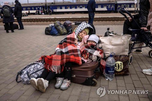 담요 쓰고 피란열차 기다리는 우크라 어린이 |