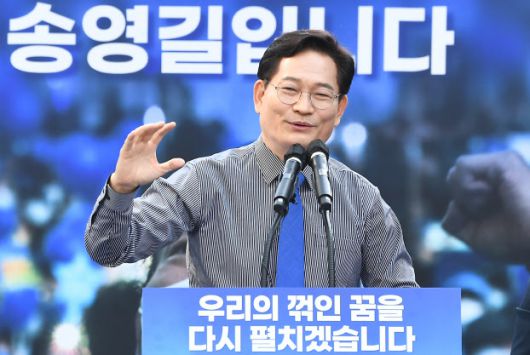 송영길 전 더불어민주당 대표가 17일 서울 마포구 홍대 상상마당 광장에서 서울시장 출마 선언 기자회견을 하고 있다. (사진=국회사진기자단) |