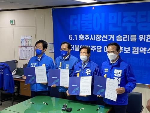(충주=연합뉴스) 권정상 기자 = 더불어민주당 소속 충북 충주시장 예비후보 4명의 '원팀' 선언이 이틀 만에 공염불이 됐다.