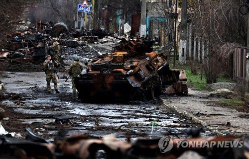 키이우 외곽 도시에 널브러진 러시아군 탱크 |