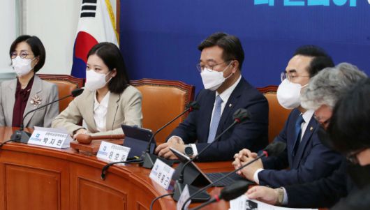 박지현 더불어민주당 공동비대위원장(왼쪽에서 두번째)이 20일 오전 국회에서 열린 비상대책회의에서 발언하고 있다. 국회사진기자단 |