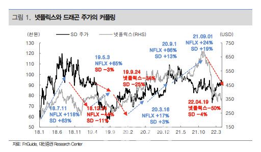 김회재 대신증권 연구원은 “넷플릭스 가입자 증가가 둔화되면 넷플릭스의 투자가 감소할 것이라는 우려가 스튜디오드래곤 주가 하락에 반영됐다”면서 “스튜디오드래곤은 상장 이후 대체로 넷플릭스 주가와 연동돼 움직였다”고 분석했다. 하지만 그는 “지금이 드래곤에 투자하기 매우 적절한 시점이라고 판단한다”고 말했다.