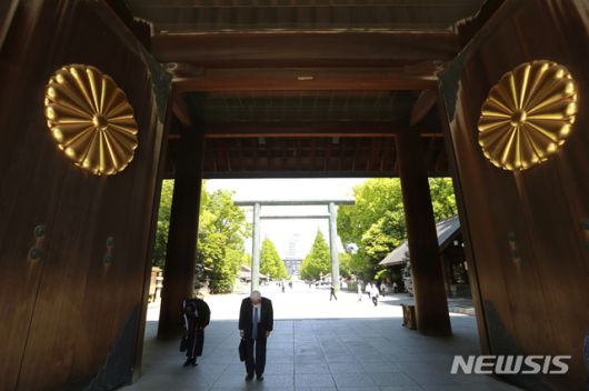 [도쿄=AP/뉴시스]일본의 춘계 예대제 첫날인 21일 도쿄 야스쿠니 신사에서 참배객들이 입장하고 있다. 일본의 A급 전범들이 합사된 야스쿠니 신사에서 이틀 일정으로 춘계 예대제가 열려 스가 요시히데 총리가 공물을 봉납하고 아베 신조 전 총리는 참배한 것으로 알려졌다. 2021.04.21. |