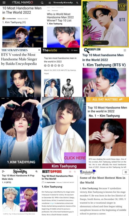 이 밖에도, ‘thewistle’, ‘WEBBSPY’, ‘The Alldamatterz’, ‘Aammat’, ‘Rewariyasat’, ‘Spindity’, ‘bscholarly’ 등 다양한 엔터테인먼트 사이트가 ‘브래드 피트(Brad Pitt)’, ‘노아 밀스(Noah Mills)’, ‘제인 말리크(Zayn Malik)’ 등의 글로벌 스타들을 제치고 뷔를 2022년 가장 잘 생긴 남자로 선정했다.