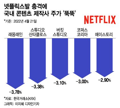 세계 온라인동영상서비스(OTT) 시장에서 절대 강자로 꼽히는 넷플릭스 주가가 폭락하자 국내 콘텐츠 제작사 주가도 일제히 하락세를 보였다. 국내 콘텐츠 제작사가 그동안 넷플릭스에 콘텐츠를 공급했다는 사실을 부각하며 덩치를 불려온 만큼 넷플릭스 주가와 연동된 모습을 보이고 있다. 하지만 증권가에서는 현 하락세가 오히려 국내 콘텐츠 제작사를 저가 매수할 기회라고 조언한다.
