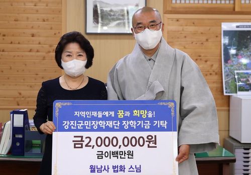 (강진=연합뉴스) 조근영 기자 = 전남 강진군은 대한불교조계종 월남사 법화 주지 스님이 장학금 200만원을 군민장학재단에 기탁했다고 21일 밝혔다.