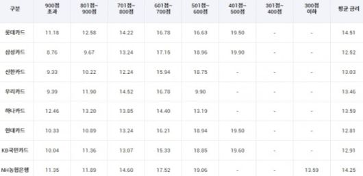 현대카드와 NH농협카드의 평균금리가 한 달 만에 1%p 넘게 떨어졌다. KB국민카드와 신한카드는 각각 0.82%p와 0.61%p 하락했다. 반면 하나카드는 지난달 전달 대비 1.75%p 올랐으며, 우리카드도 지난 2월보다 0.01%p 상승했다.