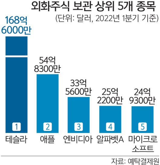 외화주식 보관금액 상위 종목은 모두 미국 주식이 차지했다. 특히 1위인 테슬라의 경우 168억6000만달러(약 21조원)로 전체 외화주식 보관금액의 21.5%였다. 테슬라는 1분기 결제금액도 115억9000만달러(약 14조원)로 전체 1위였다.