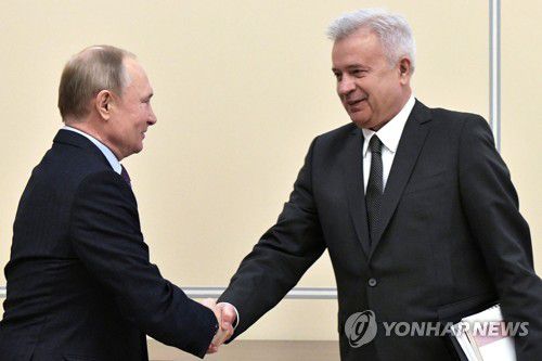 블라디미르 푸틴 러시아 대통령과 악수하는 바기트 알렉페로프 루크오일 회장 [AP 연합뉴스 자료사진 제공. 재판매 및 DB 금지] |