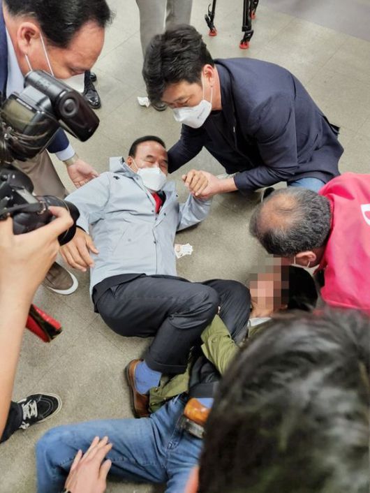 국민의힘 충북 괴산군수 이준경 예비후보의 부인이 21일 충북도당에서 박덕흠 의원의 다리를 잡고 경선 결정에 항의하고 있다. 괴산군수 경선 주자들은 3회 연속 낙선한 송인헌 예비후보 경선 참여에 반발하고 있다. 뉴시스 |
