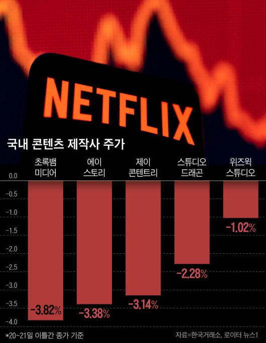 넷플릭스 실적 발표 후 21일까지 2거래일간 콘텐츠 제작사 주가는 2~3%대 하락세를 보였다. 대형사인 제이콘텐트리(036420)는 3.14% 하락했고, 스튜디오드래곤(253450)은 2.28% 내렸다. 같은 기간 코스닥지수가 0.2% 하락하는 데 그친 것과 비교하면 ‘넷플릭스 악재’를 반영한 모습이다. 초록뱀미디어(047820), 에이스토리(241840)도 3% 넘게 하락했고, 위즈윅스튜디오는 1%대로 내렸다.