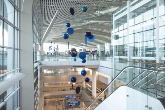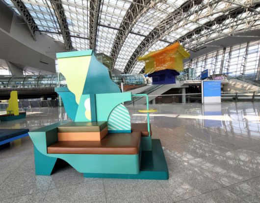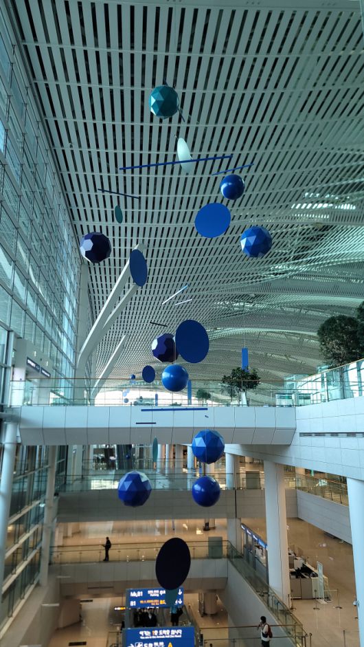 제1여객터미널도 충분히 예술적이지만 제2여객터미널은 작정하고 ‘아트포트(Art Port)’로 설계됐다. 에스컬레이터를 타고 2층·3층으로 올라가면서 점점 작품에 가까이 다가서게 되는 ‘그레이트 모빌(Great Mobile)’은 공항의 랜드마크다. 2018년 초에 설치된 프랑스 작가 그자비에 베일랑의 작품이다. 베일랑은 2009년 현대미술가로는 제프 쿤스에 이어 두 번째로 베르사유궁전에서 개인전을 열었고 2017년 베니스비엔날레 프랑스 국가관을 대표한 거장이다. 원판부터 다면체까지 다채로운 형태의, 파랗지만 어느 하나 같은 파란색인 게 없는 18개의 구조물들이 18.5m에 달하는 높이로 설치됐다. 제2터미널 3층 4번과 5번 출입구 부근이다. 오르내리며 푸른색의 변주를 보는 게 큰 재미다. 저마다 색이 다른 5대양의 바다색이요, 낮밤으로 달라지는 6대주의 하늘색이다. 아주 미세하게 작품이 움직인다. 옛 집 처마 끝에 매달린 풍경이 봄바람에 나긋나긋 흔들리는 그 정도의 속도다. 푸른색 구조물의 잘 다듬어진 표면들이 빛과 만나 이리저리 반짝일 때마다 떠나는 이의 설렘과 기다리는 이의 반가움이 증폭된다.