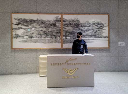 한편 제2여객터미널 안쪽에는 일반인의 접근이 제한된 귀빈실이 있다. 국빈급 손님이 머무를 수 있는 방에는 조선 전기 화가 안견의 ‘몽유도원도’를 현대적으로 해석한 석철주의 ‘신몽유도원도’가 신비로운 분홍빛을 발산하며 자리 잡고 있다. 국립현대미술관 미술은행에 의뢰해 대여했는데 공간의 성격에 이보다 더 잘 맞을 수 없는 작품이다. 귀빈실의 그림들은 대체로 한국적 정취를 강하게 드러낸다. 귀빈실 초입에 걸린 김용석의 ‘소공원 1,2’ 속의 숲 풍경은 공항 진입로의 소나무들과 닮았다. 반기문 전 유엔 사무총장이 잦은 출입국 과정에서 이 그림과 마주칠 때마다 정겨움과 흐뭇함을 드러냈다고 한다. 공항은 출발지이자 도착지다. 여행의 끝, 설렘의 마무리는 우리 집이 있는 내 땅에서 느끼는 안도감이다.