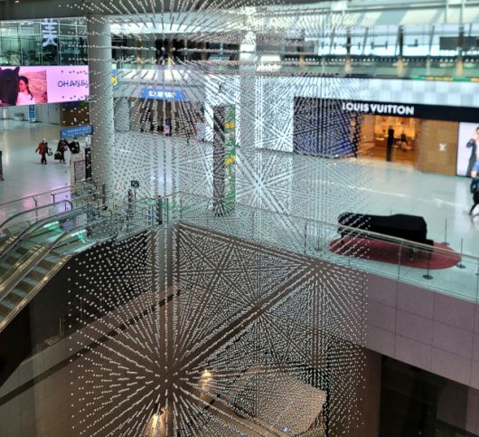 출국장 면세구역에는 박선기의 ‘집합190707’이 설치돼 있다. 루이비통 매장 앞쪽이다. 표면이 매끈한 작은 금속구 수천 개를 수직 수평에 맞춰 치밀하게 배열했다. 그렇게 공간에 자리 잡은 작은 빛 덩어리들은 공기의 흐름에 따라 미세하게 흔들리기도 하며 인연이 오가는 공항을 장악한다.