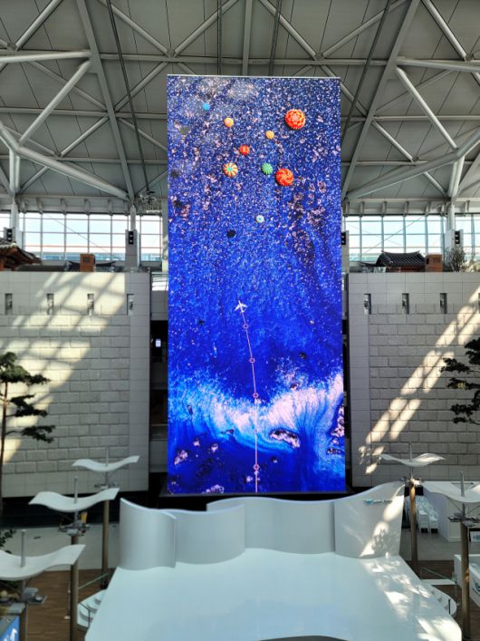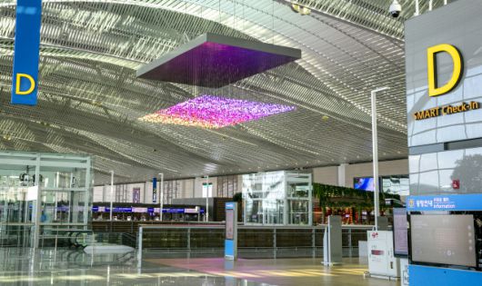 인천국제공항은 곳곳에서 빛의 재잘거림을 경험할 수 있다. 제2여객터미널 중앙부 천장에 설치된 강희라의 ‘헬로우(Hello)’는 한글 자·모음 1000개가 매달려 속삭이는 환영의 인사말이다. 작품은 서서히 붉은색에서 보라색을 거쳐 파랑과 초록과 노랑으로 색을 바꾸는데, 그때마다 감상자들의 표정도 달라진다. 이곳 1층 수하물수취지역 서쪽에는 독일 작가 율리어스 포프의 폭포형 미디어아트를 볼 수 있는데 실시간 뉴스피드에서 노출 빈도가 높은 단어들이 9개 언어로 무작위 표출된다. 우리는 잠시 공항에 정박해 있으나 바깥 세상에서는 시시각각 변화가 이뤄지고 있음을 일깨운다. 포프는 2015년 국립현대미술관 서울관에서도 비슷한 형식의 대형 작품을 선보인 적이 있다.