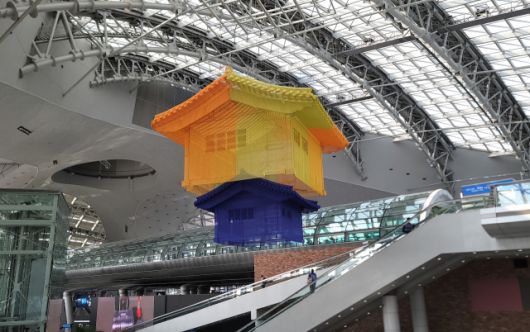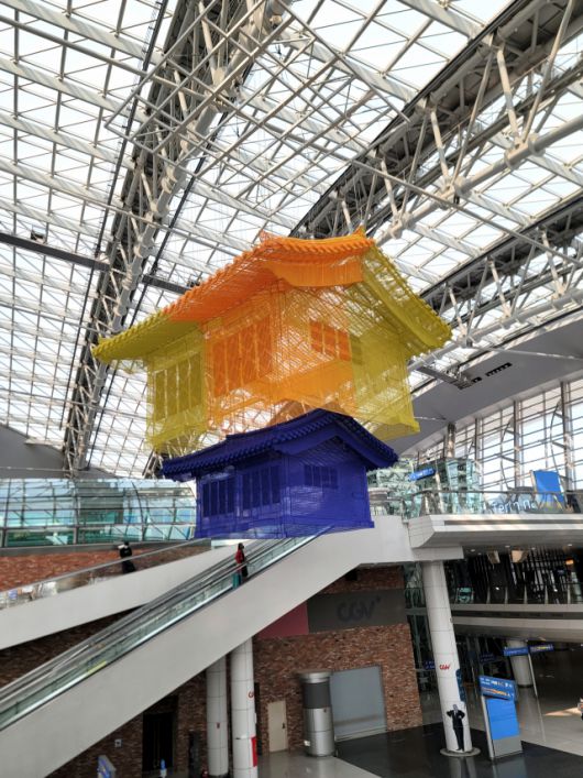 공항은 여행의 시작이자 설렘이다. 코로나19의 세계적 대유행 이후 2년 넘게 하늘길이 막혀 있었으니 모처럼 가는 공항은 부푼 꿈이다. 여행이 설레는 것은 돌아갈 집이 있기 때문이다. 공항철도와 연결되는 인천국제공항 제1여객터미널의 교통센터. 공항이 건네는 첫인사는 ‘집’이다. ‘오즈의 마법사’에서 바람에 날려간 도로시의 집처럼 휘영청 높이 매달린 서도호의 ‘집 속의 집’. 태양을 업은 듯 밝게 빛나는 노랑과 주홍색의 집, 바다를 안은 듯 짙푸른 파란 집이 위아래로 걸렸다. 육중한 집이 가볍게, 단단한 집이 투명하게 다시 태어났다.