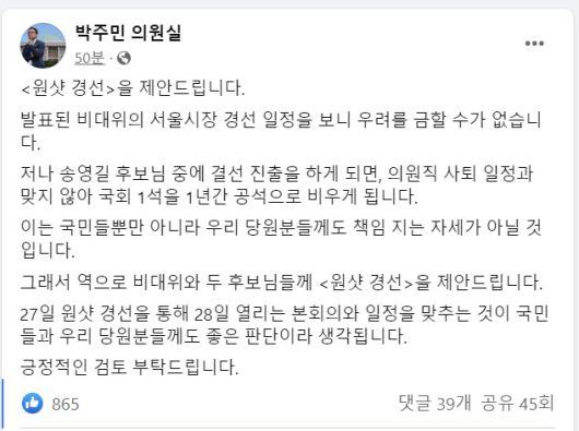 박 의원은 이날 페이스북에 “발표된 비대위의 서울시장 경선 일정을 보니 우려를 금할 수 없다”며 “저나 송영길 후보님 중 결선 진출을 하게 되면 의원직 사퇴 일정과 맞지 않아 국회 1석을 1년간 공석으로 비우게 된다”고 지적했다.