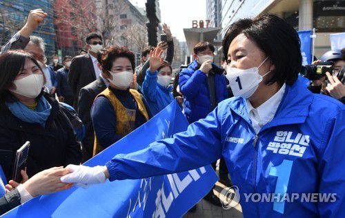 지지자들과 인사하는 박영선 전 장관 |