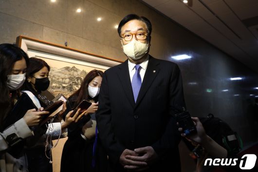 정진석 국회 부의장이 22일 오전 국회 의장실 앞에서 '검수완박(검찰 수사권 완전 박탈)' 관련 취재진들의 질문에 답하고 있다. (공동취재) 2022.4.22/뉴스1 © News1 유승관 기자 |