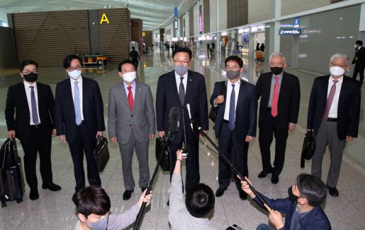 윤석열 대통령 당선인이 파견하는 한일정책협의대표단 정진석 단장 등이 24일 오전 인천국제공항 제2여객터미널을 통해 일본으로 출국 전 취재진과 질의응답을 하고 있다. 뉴시스 |
