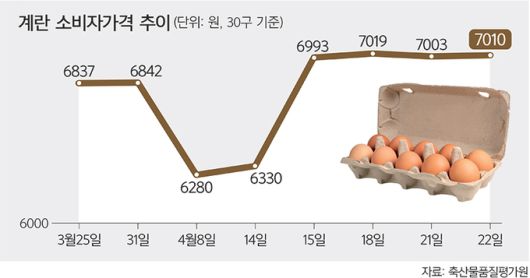 24일 축산물품질평가원에 따르면 지난 22일 기준 특란 30구(1판)의 평균 소비자 판매 가격은 7010원(발표일 기준)으로 1개월 전(6358원)보다 10.3% 올랐다. 이달 초만 해도 6000원대 초반이던 계란 평균 가격은 지난해 8월4일(7038원) 이후 약 8개월 만인 지난 18일(7019원) 7000원 선을 돌파한 뒤 좀처럼 떨어질 기미가 보이지 않고 있다.