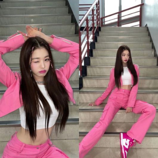 공개된 사진 속에는 계단에 앉아 포즈를 취하고 있는 장원영의 모습이 담겨있다. 장원영은 크롭재킷, 바지, 신발을 핑크색으로 맞춰 입었다. 특히 비현실적인 다리 길이와 크롭티로 드러난 개미허리가 눈길을 끈다.