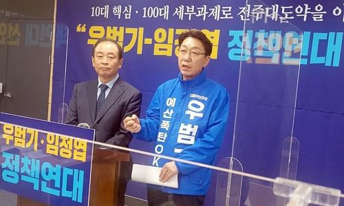 (전주=연합뉴스) 백도인 기자 = 전북 전주시장 선거에 나선 우범기 예비후보와 임정엽 출마 예정자의 정책연대 선언이 막판 최대 변수로 떠오르고 있다.