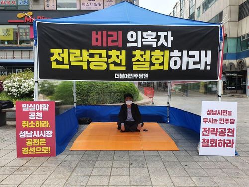 조 예비후보는 배 전 차관 공천에 대해 입장문을 내고 "시민과 당원을 철저히 무시한 '낙하산 공천'"이라며 철회를 요구했다. 아울러 야탑역 광장에서 무기한 단식농성에 들어갔다.