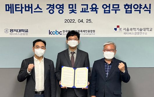 (재)한국에이아이블록체인융합원과 홍익대학교 메타버스금융랩, 서울과학기술대학교 메타버스경영연구소는 메타버스 인재 양성을 위한 협약을 맺었다고 25일 밝혔다.