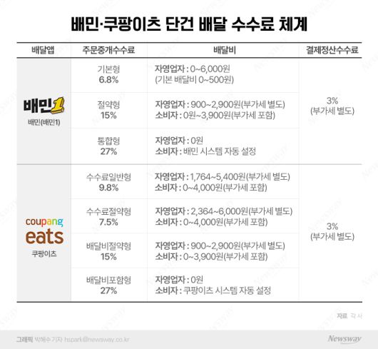 ◇배민보다 '순매출 기준' 쿠팡이츠가 유리하다=소비자가 부담하는 배달비를 업체 매출로 포함 시킬 경우 그에 따른 '부가세'도 자영업자가 내고 있는 것도 문제점으로 지적된다.