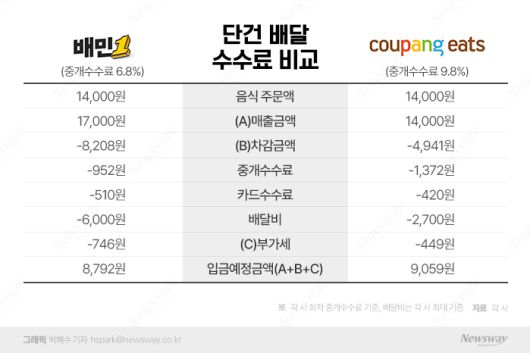 쿠팡이츠를 이용할 경우 업체가 가져가게 되는 비용은 9059원으로 배민1 기본형과 비교하면 276원이 많은 셈이다.