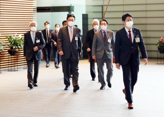 정진석 국회 부의장 등 윤석열 대통령 당선인이 일본에 파견한 한일 정책협의대표단이 26일 오전 기시다 후미오 일본 총리를 면담하기 위해 일본 총리관저에 도착해 이동하고 있다. |