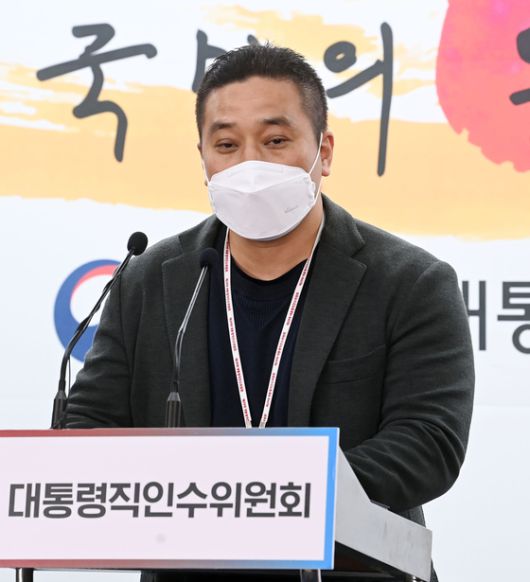 (서울=뉴스1) 인수위사진기자단 = 고산 대통령직인수위원회 경제2분과 인수위원이 26일 서울 종로구 통의동 인수위 기자회견장에서 산업기술 R&D 시스템과 관련해 브리핑을 하고 있다. 2022.4.26/뉴스1 |